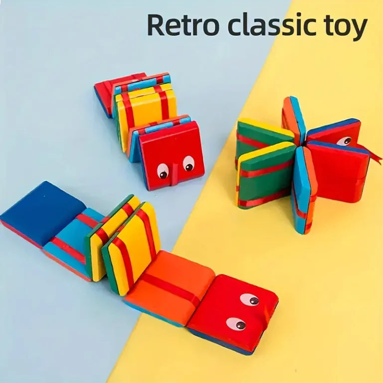 Fidget toy consists of blocks of wood held together by ribbons. When the ladder is...