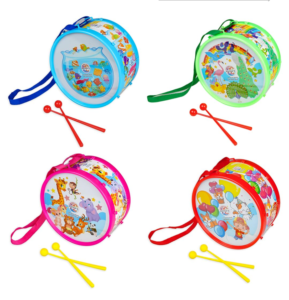 Features four vibrant color optionsΒ with different themed illustrations Includes a toy drum with carrying...