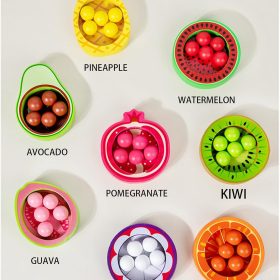 - This wooden sorting and stacking toys has 8 fruits shaped cute wooden fruit organizer, including pineapple, watermelon, kiwifruit, avocado, guava, pomegranate, orange, mangosteen, and each fruit comes with 5 wooden beads, 1 wooden spoon, a plastic clip, and a storage bag.
