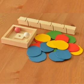 Arrange all the colored chips in the wooden column, place the ball on top of the column. The ball will roll down to bottom through Colorful Leaves. Improves Children’s Hand Eye coordination skills, Color Identification, Accomplish Challenge by installing Tree Leaves Track