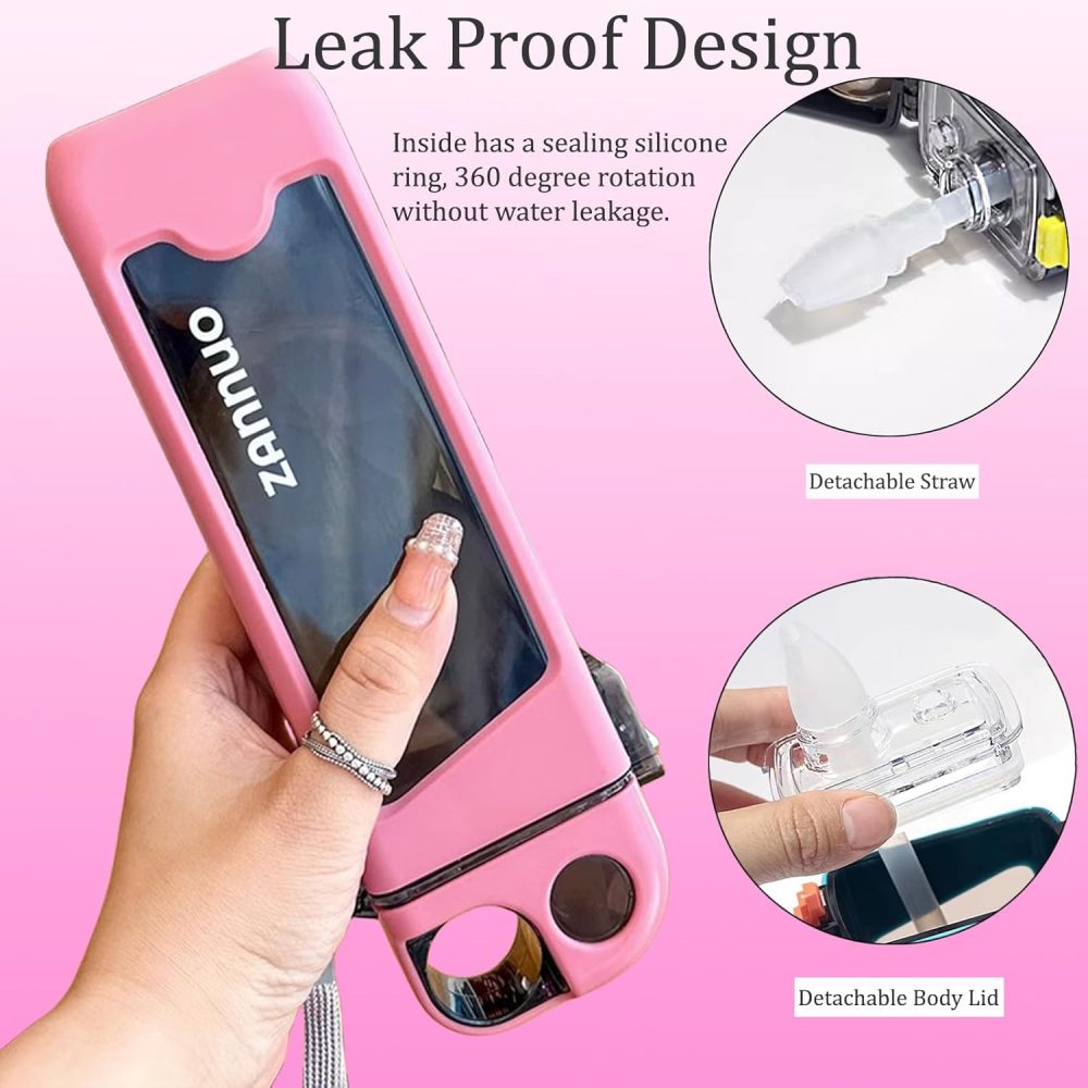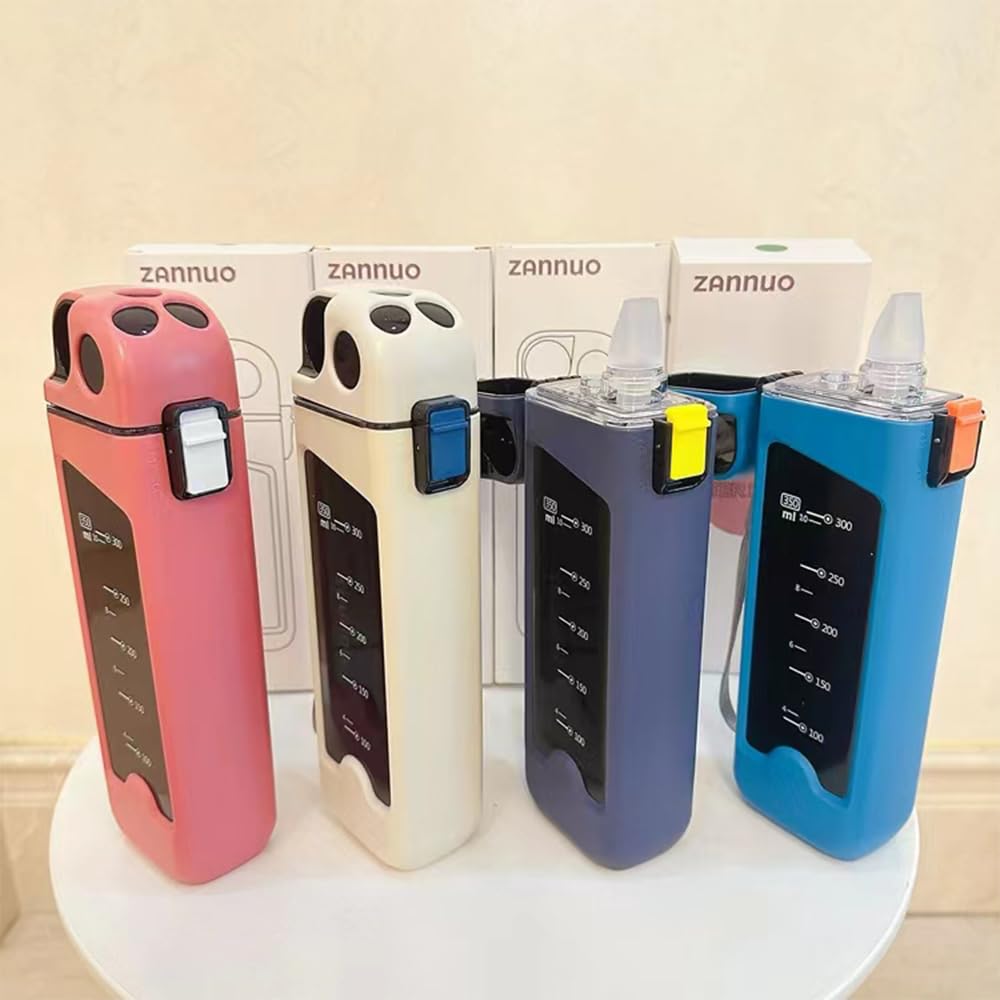 - Our 350ml water bottles is equipped with duckbill straw and a carry strap. And you also have a four colors to choose. The connection between the bottle cap and the bottle body is detachable, making it easy to wash clean.