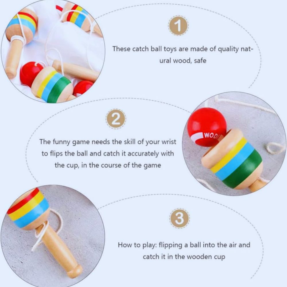 - Experience the Joy of Skill and Precision: Master the art of hand-eye coordination with our Wood Catch Ball Game. Toss the ball and aim to catch it in one of the cups or spear it with the stick’s point.