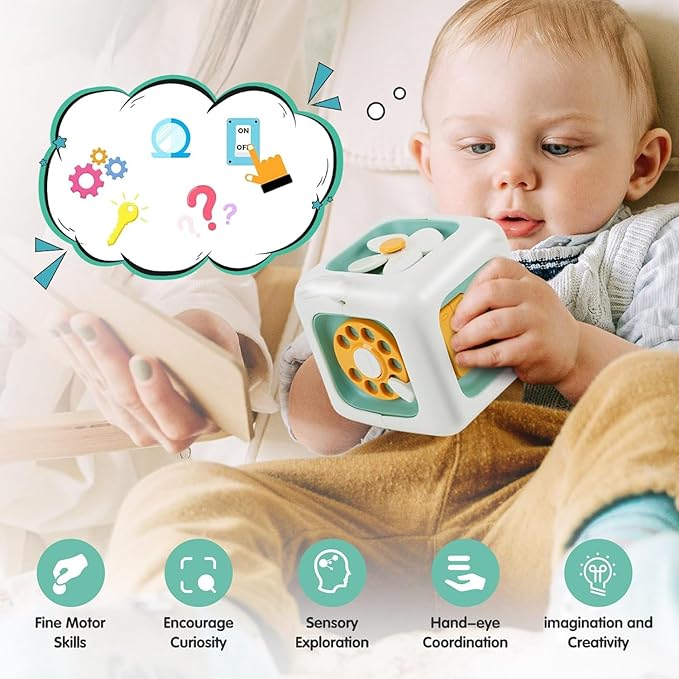 - 6-in-1 Cognitive Learning Fun: Dive into a world of educational play with our interactive busy cube. Packed with six engaging activities, this toy encourages your child's development through play.