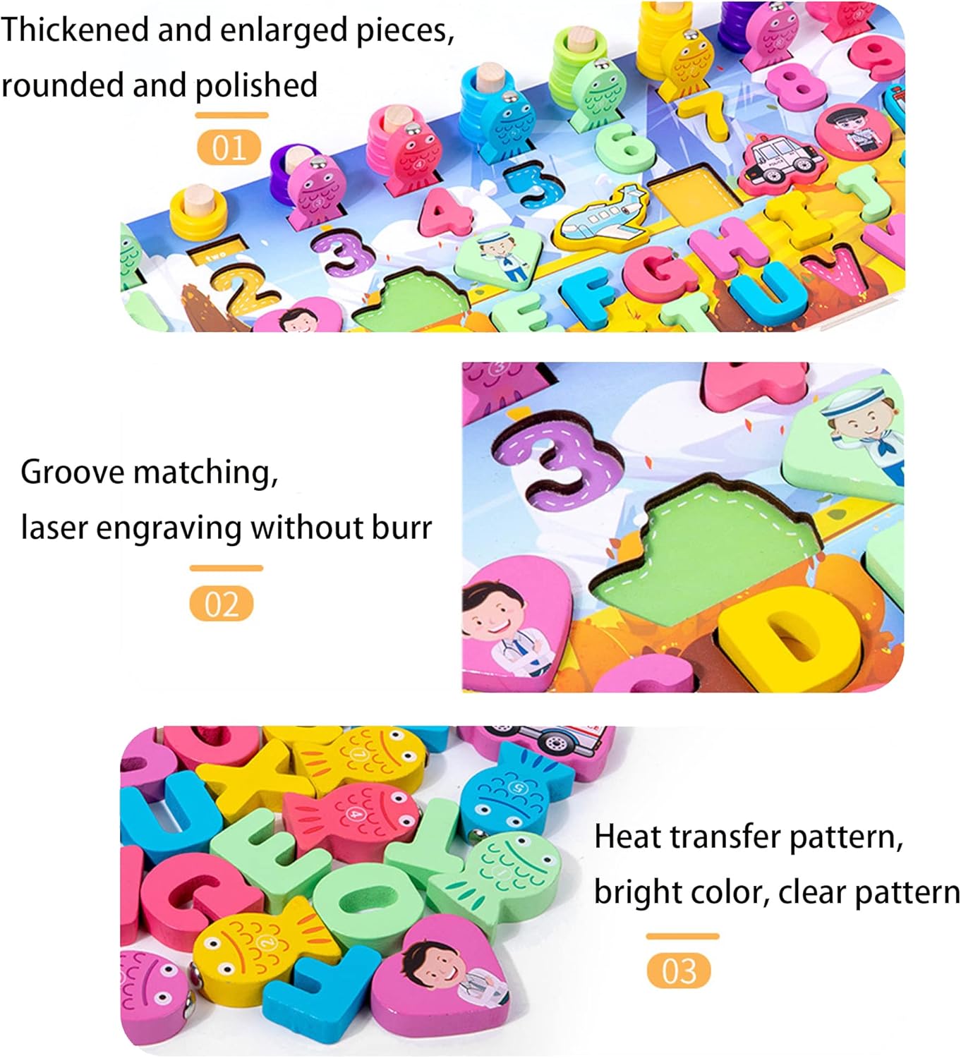- Our playsets include various learning elements such as numbers, letters, puzzles, fishing games, graphic recognition, vehicle recognition, professional recognition, etc., which can satisfy children's movement and inspiration in all aspects.