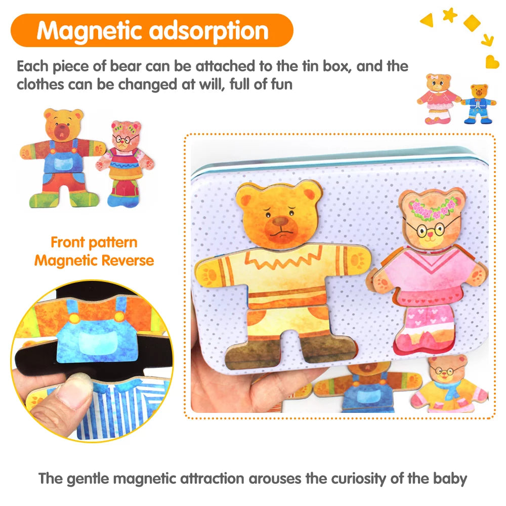MIX-AND-MATCH OUTFITS-- it is great fun to dressing up each one of them and make up your own stories along for bear family activities.-Nice Wooden jigsaw puzzle with box and the game can be adsorbed on the iron box. It is easy to be packed away.