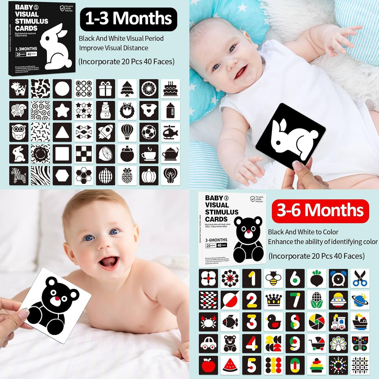 - Safe materials for your baby's health: These high-contrast newborn cards are made of double-sided film, with an anti-glare matte surface that's easy to recognize and protects your baby's eyes. Printed with high-quality ink, the newborn contrast cards are clear, fresh, and odorless.
